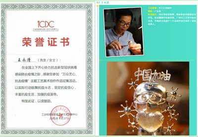在全國上下齊心協(xié)力抗擊新冠疫情之際,穗聯(lián)公司打金制作技藝市級非遺傳承人王永清制作的《致敬抗疫英雄》足銀擺件參加了由國家工業(yè)和信息化工業(yè)文化發(fā)展中心舉辦的“萬眾藝心、抗擊疫情”主題工藝美術(shù)創(chuàng)作作品征集活動,作品獲得了主辦方的采納,在國家工藝美術(shù)產(chǎn)業(yè)公共服務(wù)平臺“‘萬眾藝心、抗擊疫情’主題工藝美術(shù)創(chuàng)作作品展(第十三期)”進行了推廣和宣傳,并向王永清個人授予榮譽證書,以資鼓勵,高度贊揚其以“藝”抗“疫”的優(yōu)秀精神。