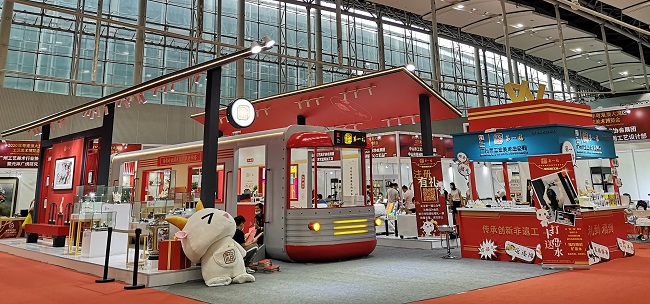 穗聯(lián)公司在展位上創(chuàng)新設(shè)計(jì),將以往的新中式風(fēng)格展臺(tái)改裝成一列穿梭著文化歷史旅途的快車“第一福號(hào)”,緊緊貼合本次展覽“老字號(hào)、新活力”的主題;同時(shí)品牌吉祥物“大福”首次面向大眾,吸引了很多市民前往拍照打卡,獲得博覽會(huì)授予的最佳展示創(chuàng)意獎(jiǎng)。通過本次展覽,吸納了數(shù)十個(gè)商戶了解業(yè)務(wù),官方公眾號(hào)增粉400人,成功用工藝美術(shù)打造了一場(chǎng)“生活+藝術(shù)”的文化盛宴。