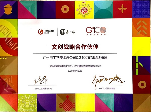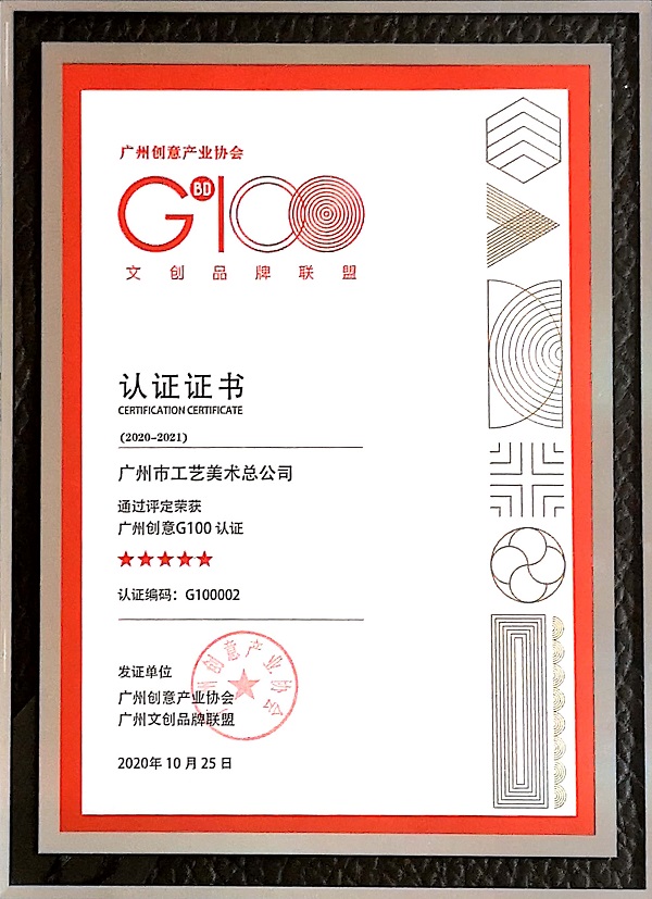 “G100創(chuàng)意100聯(lián)合品牌”是廣州創(chuàng)意產(chǎn)業(yè)協(xié)會(huì)、廣州文創(chuàng)品牌聯(lián)盟與GBDO組委會(huì)發(fā)起的聯(lián)盟認(rèn)證,在廣州市文化體制改革與文化產(chǎn)業(yè)發(fā)展辦公室指導(dǎo)支持下建立,從創(chuàng)作與提升廣州城市品牌形象的指導(dǎo)思想出發(fā),與各文創(chuàng)行業(yè)、企業(yè)一起產(chǎn)融共建。本次通過認(rèn)證,是相關(guān)機(jī)構(gòu)對(duì)廣州市工藝美術(shù)總公司致力于文創(chuàng)產(chǎn)品設(shè)計(jì)研發(fā)、活化非遺、廣州IP文旅點(diǎn)合作開發(fā)的認(rèn)可。