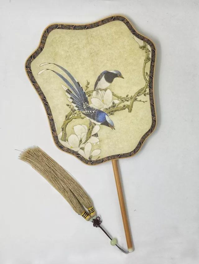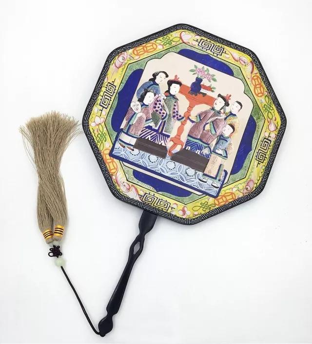 這把扇子根據(jù)廣東民間藝術博物館館藏文物《娟面八角形紈扇》仿制,扇子由中國制扇大師盛春監(jiān)制,扇框采用優(yōu)質(zhì)木料,做工精細。扇面利用細膩絹布印制了“滿大人”圖案和庭院人物,扇柄處增加鏤空設計,細致立體。