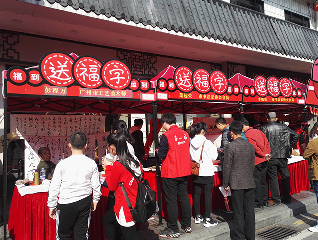 活動現(xiàn)場人頭攢動,歡聲笑語,熱鬧非凡。結(jié)合“第一?!逼放?,書法家們潑墨揮毫,奮筆疾書,一幅幅寓意吉祥的春聯(lián)和一個個飽含神韻的“?!弊衷谛性屏魉g新鮮出爐,一幅、十幅、百幅……片刻之間活動現(xiàn)場已成為一片喜慶的紅色海洋。前來“接?!钡氖忻窠j(luò)繹不絕,親手把“?!睅Щ丶?。