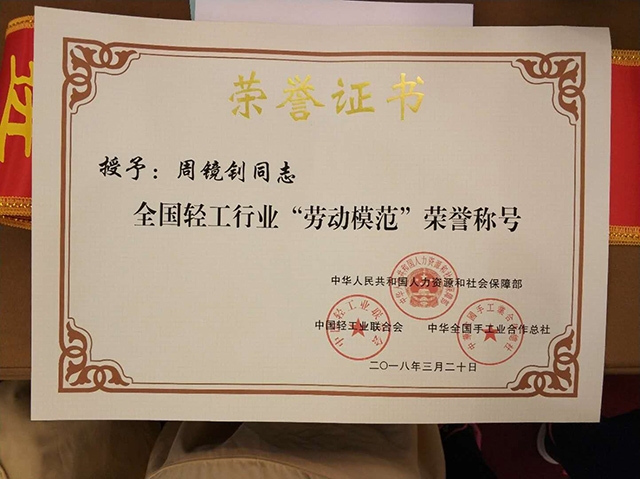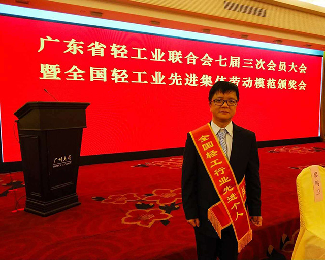 2018年4月19日,周鏡釗同志參加了廣東省輕工業(yè)聯(lián)合會(huì)召開(kāi)的表彰大會(huì),并被授予全國(guó)輕工行業(yè)“勞動(dòng)模范”榮譽(yù)稱號(hào)。